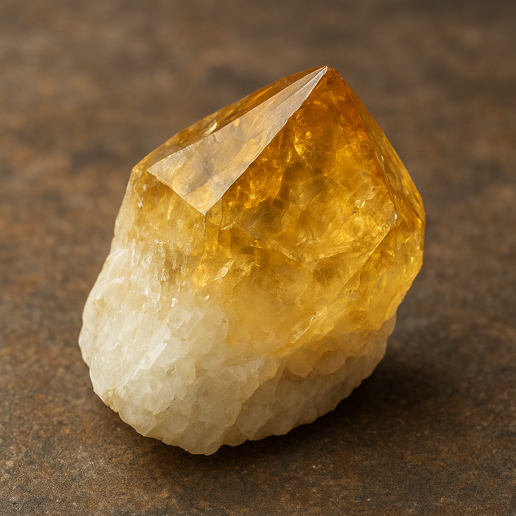 Citrine is a naturally occurring yellow to brownish-orange variety of quartz whose color is primarily caused by trace amounts of iron within the crystal lattice and by natural or artificial heating. The same silica framework that forms amethyst and smoky quartz is present, but slight differences in oxidation state and local geology produce the distinctive warm tones associated with citrine.