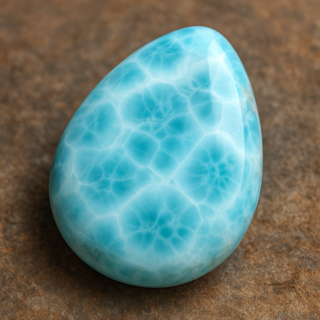 Larimar is a blue to blue-green variety of the mineral pectolite, a silicate mineral that crystallizes in radiating fibrous aggregates. The color palette ranges from pale sky-blue and aqua to deep, almost cerulean tones, often with contrasting bands or patches of white and ochre. These patterns and colors give polished specimens the appearance of waves, cloud-scapes, or the shifting tones of shallow tropical water, which contributes heavily to the stone’s aesthetic appeal and market demand.