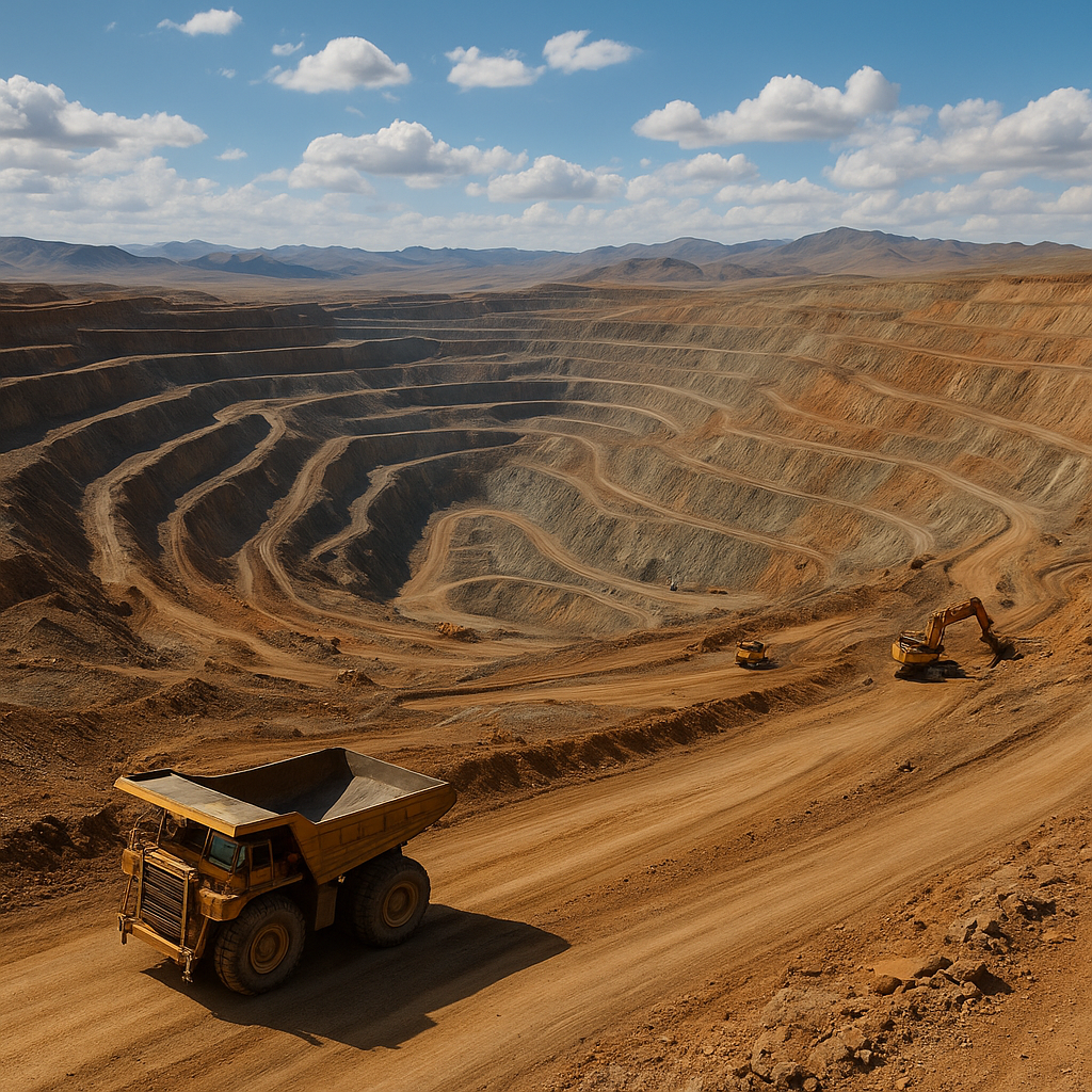 Geologically, Oyu Tolgoi is hosted in a porphyry copper-gold system, one of the most economically significant types of mineralization globally. The deposit comprises a large open-pit resource and extensive underground zones. Names given to major ore bodies, such as Hugo Dummett and Hugo North, reflect the scale and complexity of the system. The deposit formed in a magmatic-hydrothermal environment where copper-bearing fluids concentrated metals into broad, disseminated zones, suitable for both bulk open-pit mining and later block-cave underground extraction.