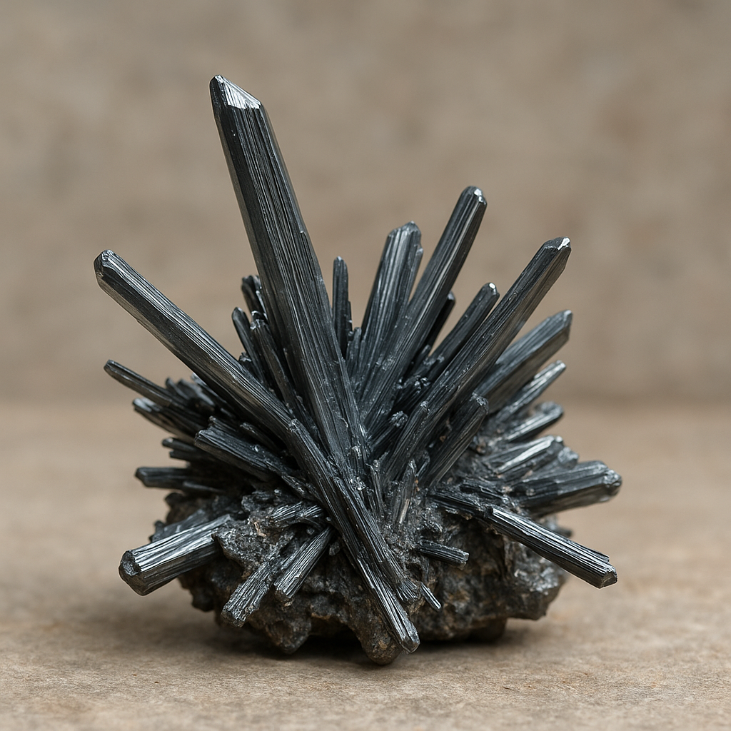 Stibnite crystals are prized by mineral collectors for their dramatic, bladed habit and metallic shine. Large, well-formed specimens can command high prices and often become centerpieces in museum collections.