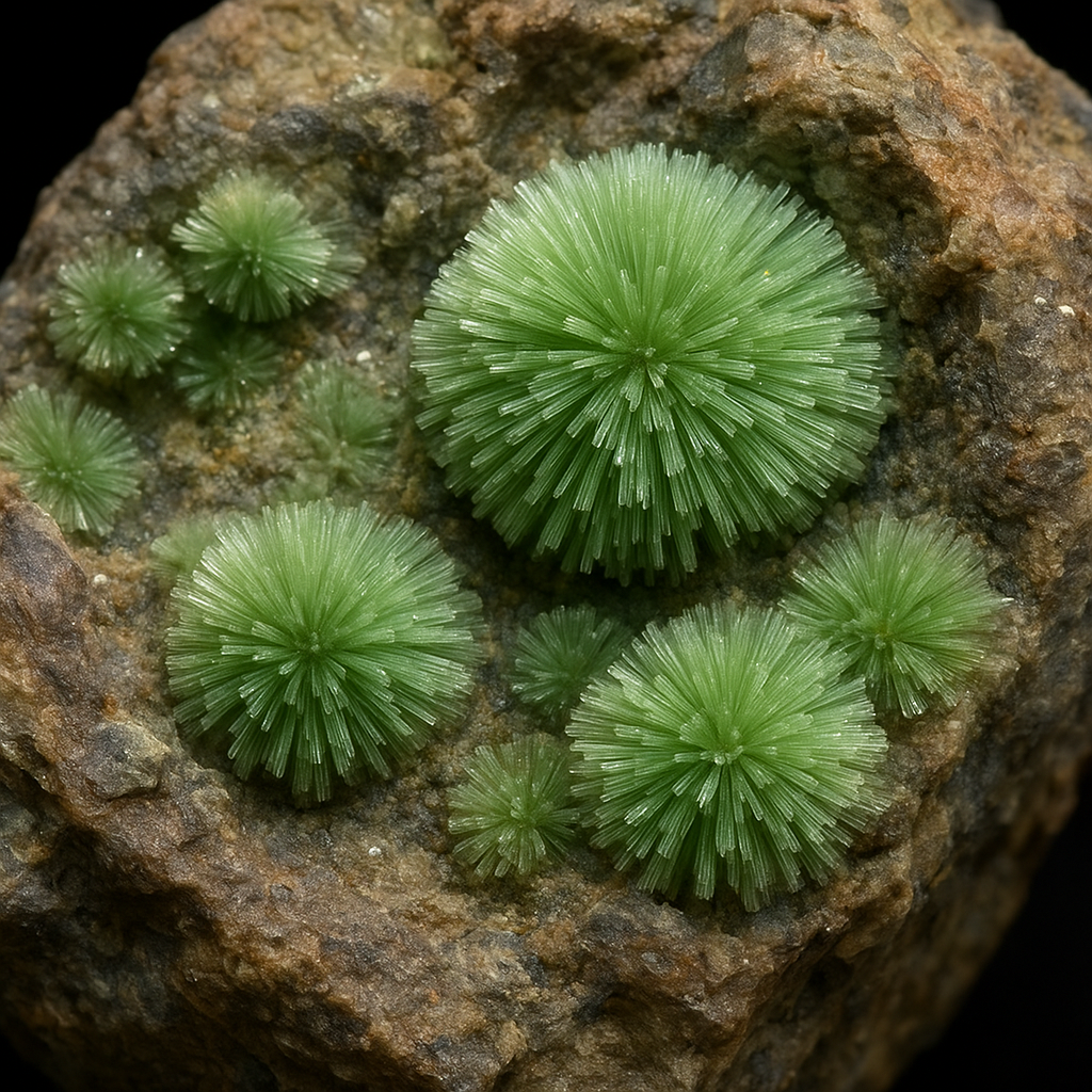 - Habit: acicular (needle-like) crystals grouped into radial sprays and spherulitic aggregates; individual crystals may be fibrous to prismatic.