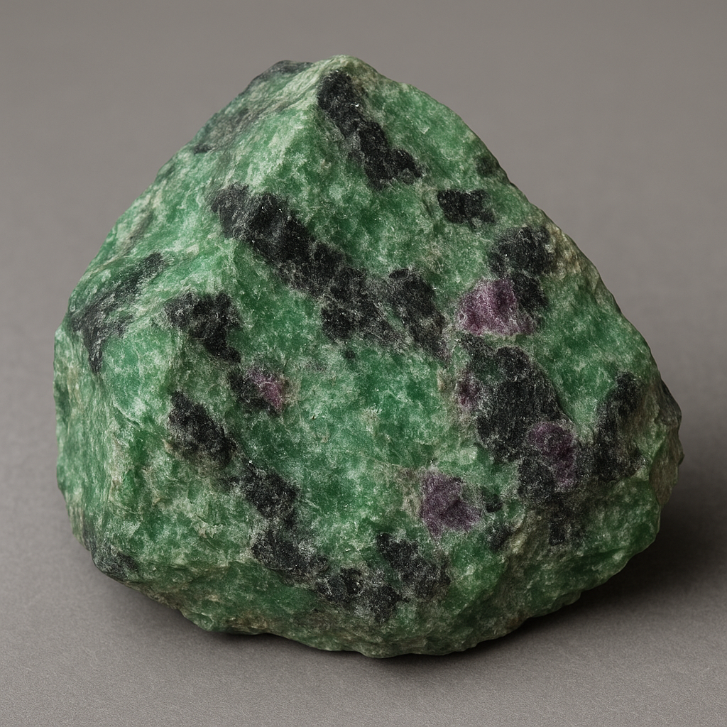 Anyolite, often marketed as “ruby-in-zoisite”, combines green zoisite with red corundum (ruby) and black minerals (commonly hornblende). It is primarily collected and carved into decorative objects. Because the ruby occurs as inclusions rather than as continuous gem material, the overall piece is usually polished or sculpted rather than faceted.